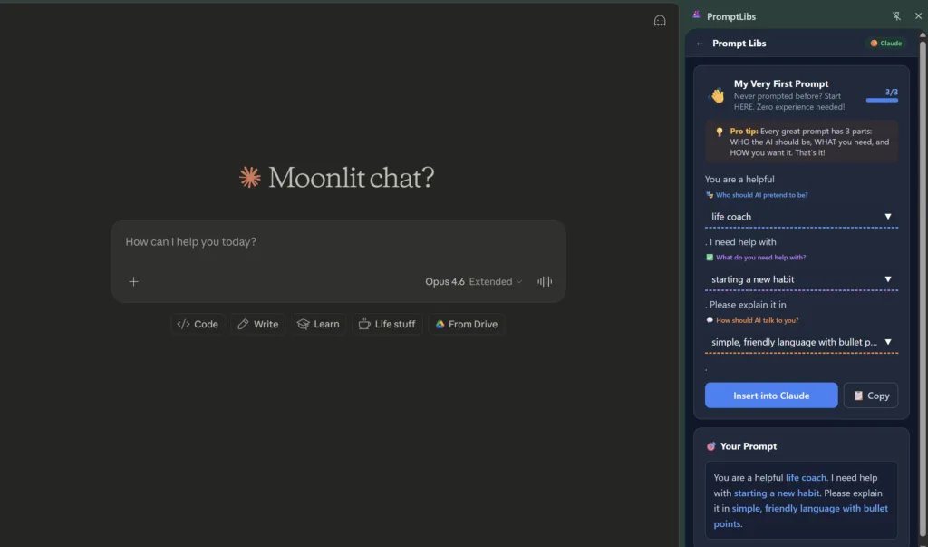 Coming to Chrome store, use prompt libs in most AI tools including Claude, ChatGPT, Co-Pilot, Snowflake Cortex, and others.