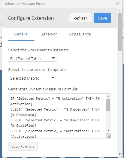 After selecting a worksheet and parameter, the extension automatically generates a Tableau formula based on all available measures. This formula can be used to create a calculated field.